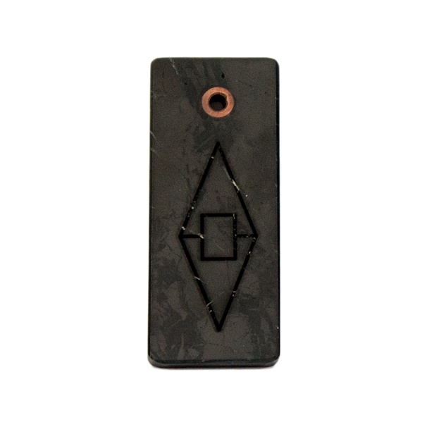 Tento šungitový přívěsek v čistém obdélníkovém tvaru je zdoben gravírovaným geometrickým motivem kosočtverce (diamantu) se středovým čtvercem. Geometrie v symbolické rovině často odkazuje na řád, harmonii, stabilitu a jasně vymezené hranice – proto je přívěsek vhodný jako osobní doplněk i jako dárek s významem.